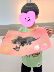 スプレーのみで背景の色塗りや型を使って模様を描いています。「海の生き物」「恐竜」「プリンセス」の3つのテーマで作品を作りました。赤、青、白、黒、金の5色を使って、ドレスは華やかに金色を入れたり、恐竜の背景を夕日のように赤くしたりと様々な工夫が見られています。